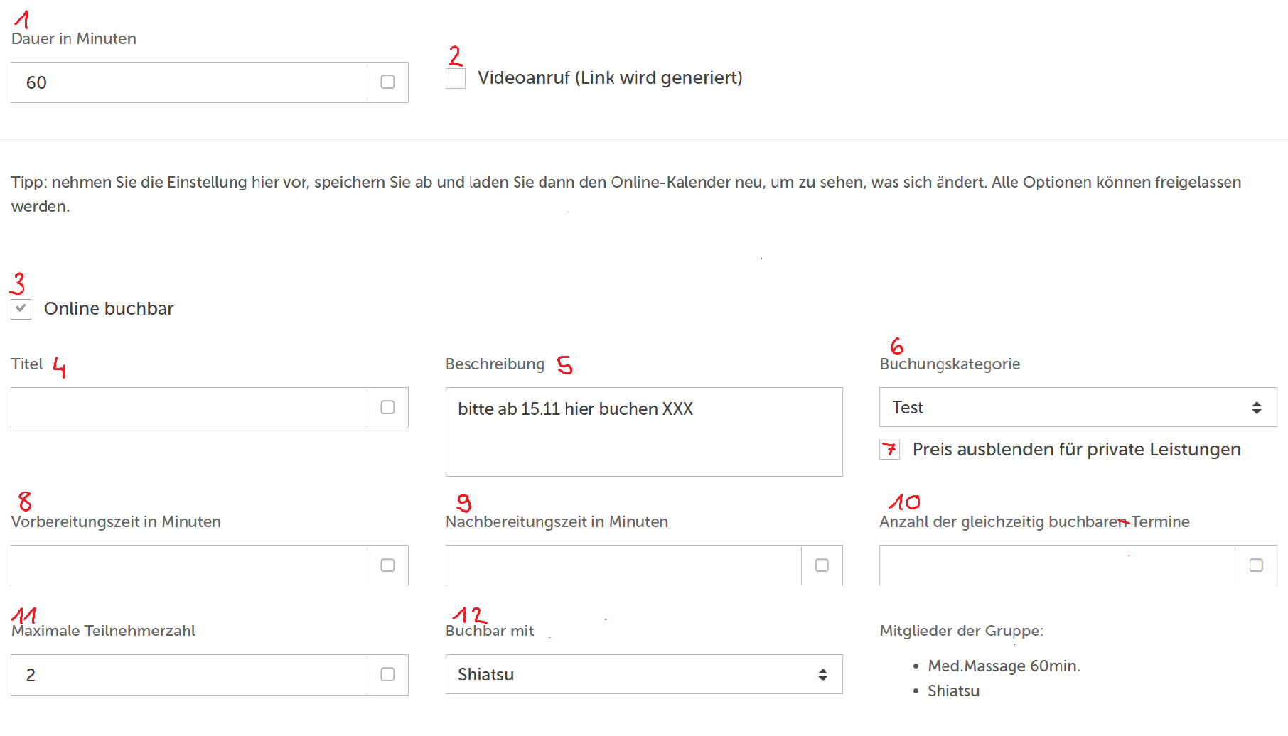 1. "Dauer in Minuten": Hier können Sie die Dauer der Behandlung eingeben. Dies wird im Termin und in der Online-Buchung angezeigt