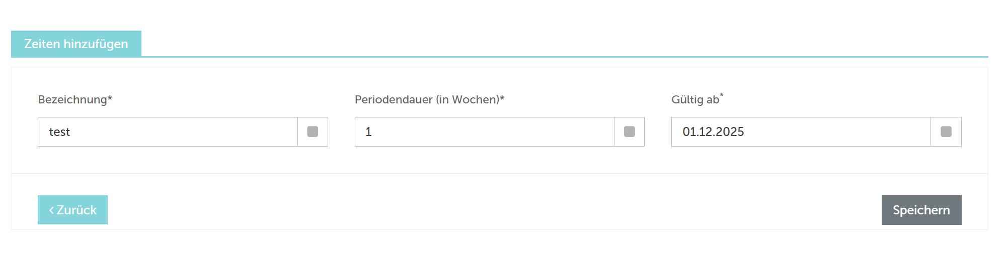 "Hinzufügen": Sie können eine neue Buchungszeit hinzufügen. Geben Sie hierfür eine Bezeichnung für die Buchungszeit ein. Weiterhin können Sie die Periodendauer und das Gültigkeitsdatum setzen.