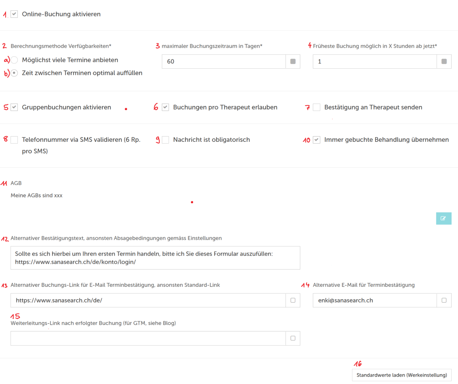 14. "Alternative Email für Terminbestätigung": Hier können Sie eine alternative E-Mail-Adresse angeben, an die die Bestätigungs-E-Mail nach einer Online-Buchung versendet werden sollte.