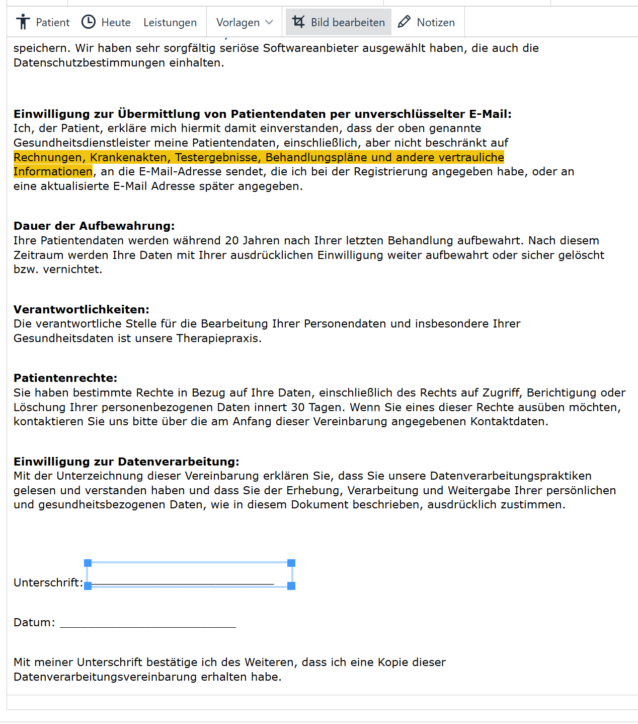 Unten können Sie über das "Zeichnen"-Feld den Stift aktivieren, mit welchem Ihre Klient:innen unterschreiben können.