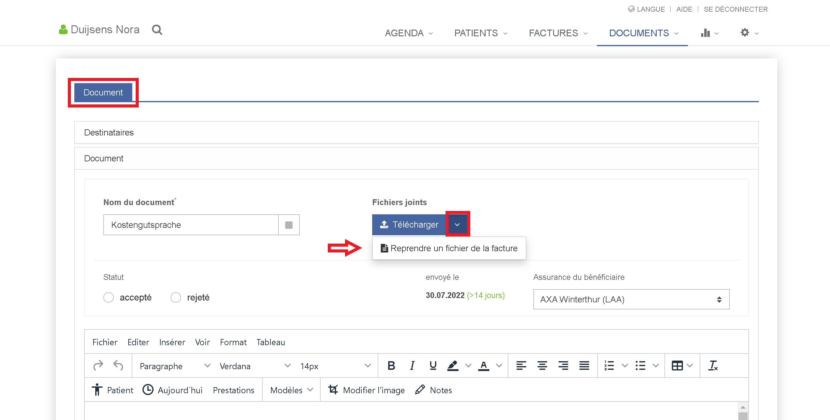 Lorsque vous envoyez une garantie de paiement via le programme, une ordonnance est généralement jointe. Afin que vous ne deviez pas copier une nouvelle fois l'ordonnance de la facture et la joindre à la garantie de prise en charge des coûts, vous pouvez désormais le faire en un seul clic :