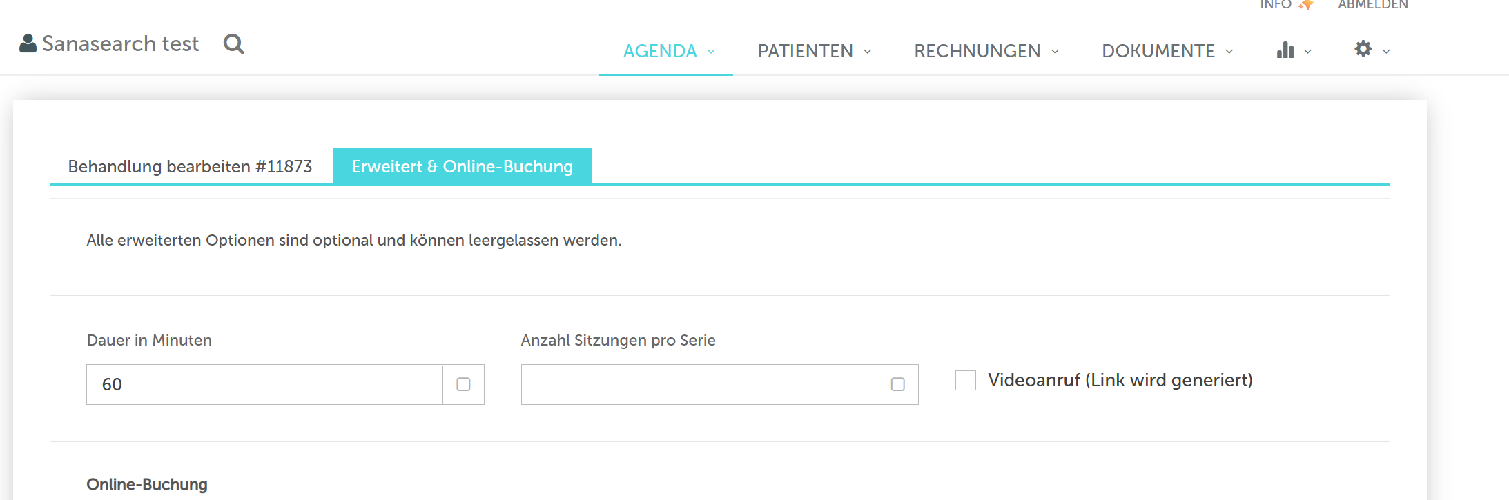Gehen Sie über "Agenda" > "Behandlungen" in die entsprechenden Behandlung zum Register "Erweitert & Online-Buchung".