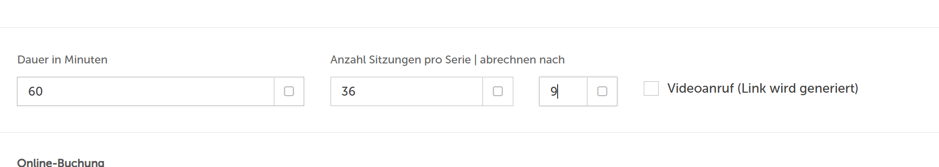Definieren Sie die Gesamtanzahl der Sitzungen (z.B. 36 oder 52). Nun erscheint automatisch ein weiteres Feld für die Anzahl Sitzungen, nach denen jeweils automatisch eine Rechnung neue erstellt werden soll (z.B 9). Die zweite Zahl muss jedoch kleiner sein.