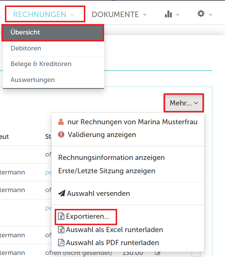 Damit Sie diese Zahlen für die Periode vom 1.1. bis 31.12. des Jahres erhalten, können Sie auf der Rechnungsübersicht über den Button "Exportieren..." exportieren: