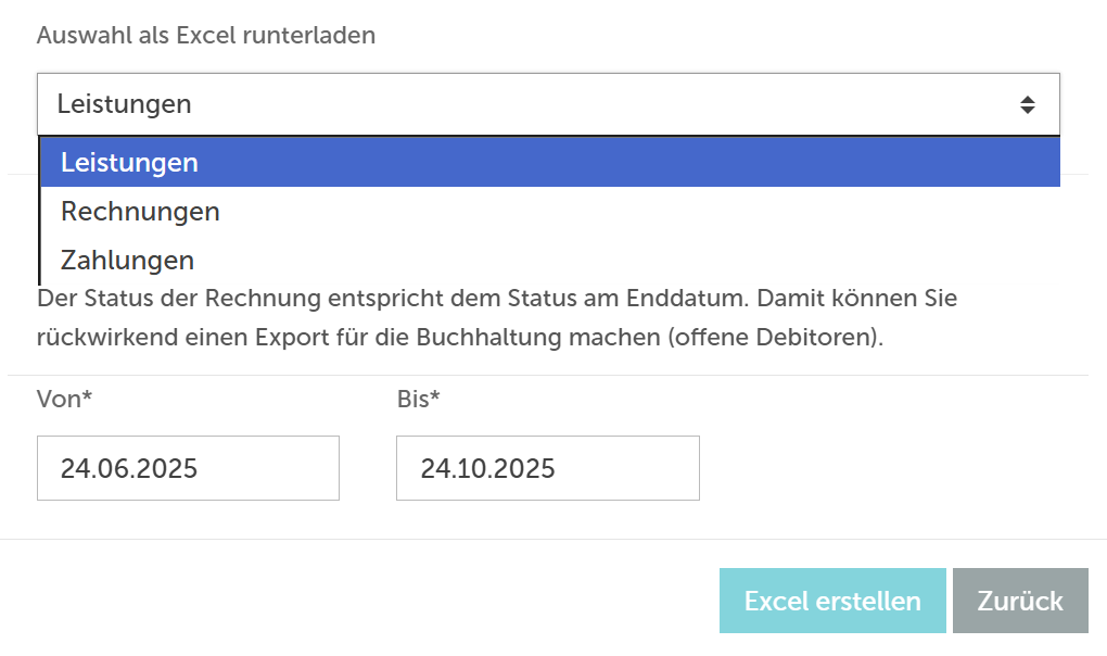 Passen Sie das Datum auf den gewünschten Zeitraum an und wählen Sie aus, was Sie exportieren wollen. Danach können Sie das Excel herunterladen, indem Sie auf "Excel erstellen" klicken. Sie erhalten nun ein Excel mit all diesen Zahlen.