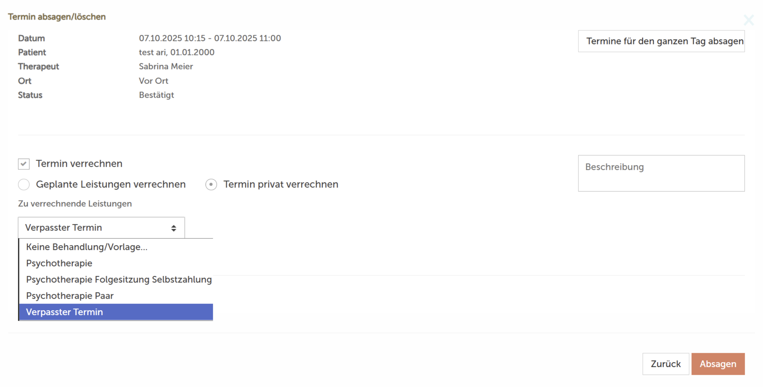 Danach gehen Sie über die Agenda in den Termin rein, welcher verpasst wurde und gehen über "Aktionen" > "Absagen/Löschen" > "Termin verrechnen" > "Termin privat verrechnen" und wählen als Leistung "Verpasster Termin" aus: