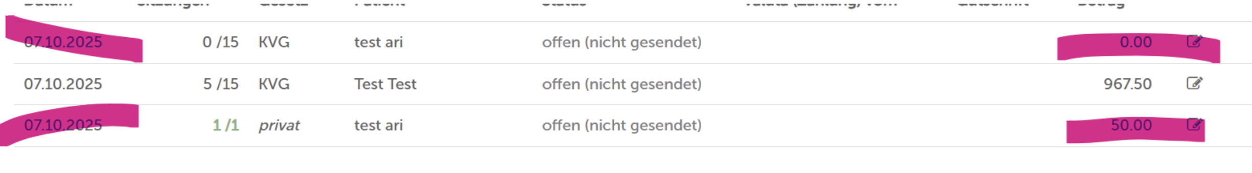 Danach finden Sie unter den Debitoren zwei Rechnungen, einmal die Rechnung, die ursprünglich gestellt war (in diesem Fall jetzt 0.-, aber ansonsten würden dort noch die anderen vorhandenen Leistungen drauf stehen) und die neue Rechnung mit dem verpassten Termin. Diese können Sie nun raussenden.