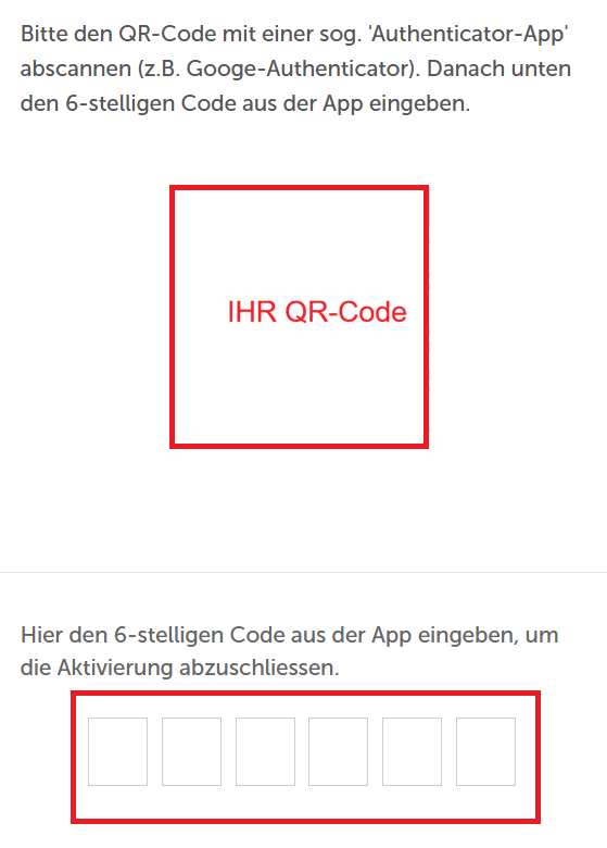Scannen Sie den QR Code mit einer 2FA-App und geben Sie den 6-Stelligen Code unterhalb ein.