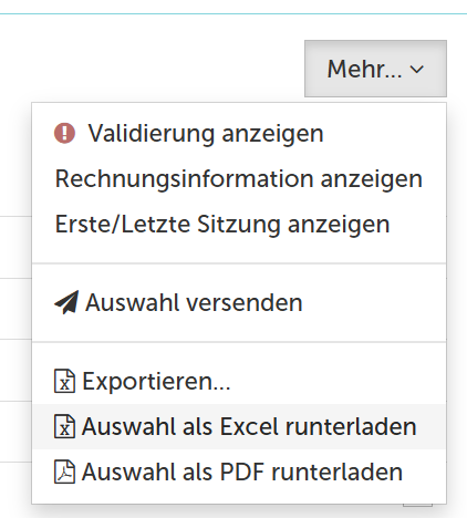 Dazu gehen Sie zu dem Register "Rechnungen", wählen das gewünschte Startdatum aus und selektionieren rechts alle (graues Häkchen oben anlicken) oder nur die relevanten Rechnungen einzeln auswählen. Danach können Sie unter "Mehr" und dann "Auswahl als Excel erstellen" auswählen: