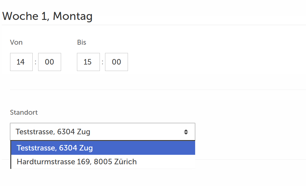 Sollten Sie mehrere Standorte besitzen, können Sie die Buchungszeiten für beide Standorte erstellen. Wählen Sie unterhalb der Zeitangabe die gewünschte Adresse aus.